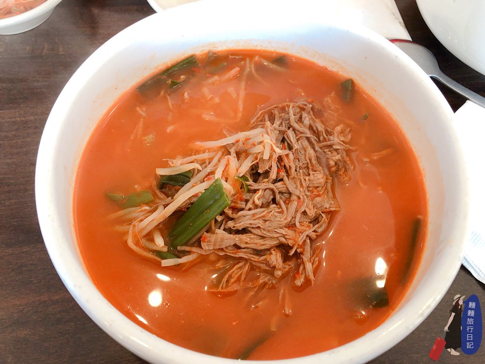 我自己當然是點辣牛肉湯,看看這碗紅通通的湯,看起來就很好吃啊~這間餐廳的牛肉湯是牛肉絲,這點讓我非常不滿啊!我想吃整片的牛肉啦~而且牛肉絲實在是太容易卡牙縫了,跟我有一樣困擾的人在下面留言處喊聲!XDDD 這碗牛肉湯裡面還有滿滿的蔬菜~味道很濃郁辣呼呼的很好喝~一口湯一口飯,白飯立馬吃光光。