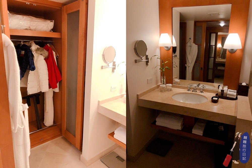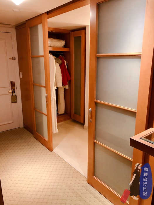 衣櫃裡面有行李架,旁邊就是洗手台囉!是單洗面台,房間裡都是木頭跟大理石做搭配,所以整體的感覺會是乾淨簡約的風格。