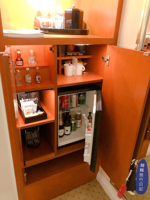 沙發椅旁邊就是茶水櫃,這個茶水櫃很像冰箱欸!櫃門打開後格子裡還會亮燈,每一格都放不同的東西!有咖啡、茶包、酒類、還藏了一台冰箱,冰箱裡面有飲料跟各式酒類,都要收錢蛤~~~而且都不便宜!想喝什麼去超市買回來比較便宜啦!