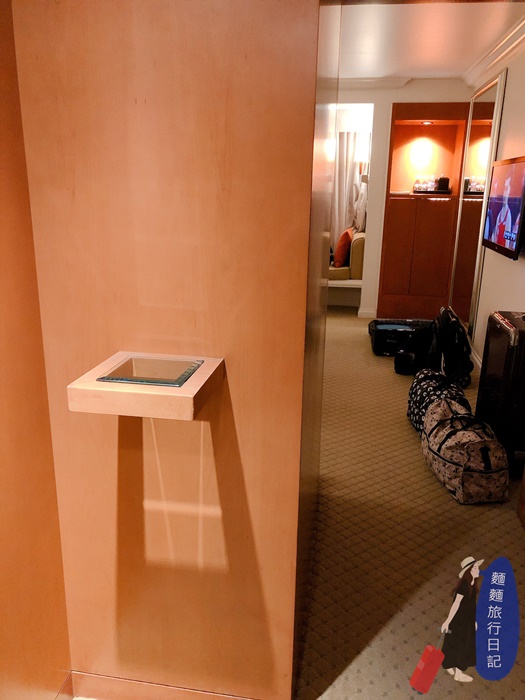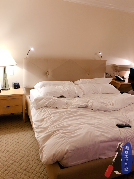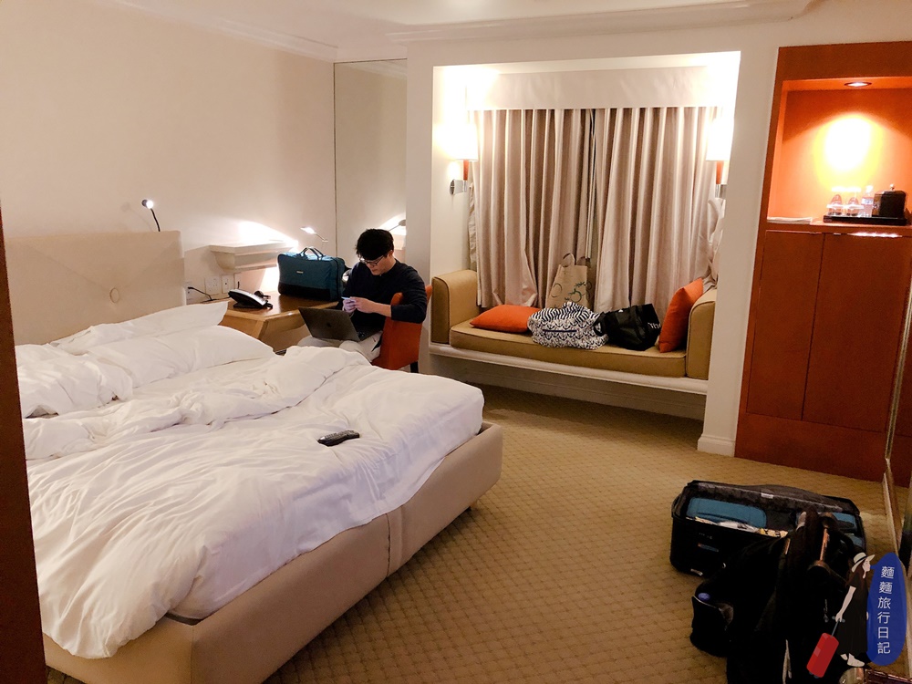 床其實滿大的,我們一家四口睡一張雙人床再加一張床,床前面有很大的空間可以讓我把行李箱攤開,我每次住飯店一定會找一個空間把行李箱攤開,這樣比較好拿取衣物、整理行李!床旁邊還有一張書桌可以當工作區,不知道為甚麼大猴要把手提行李袋放在桌上,把筆電放在腳上??? 書桌右手邊的牆面是整片的鏡子喔~~~整體視覺有無限延伸的Fu~~~