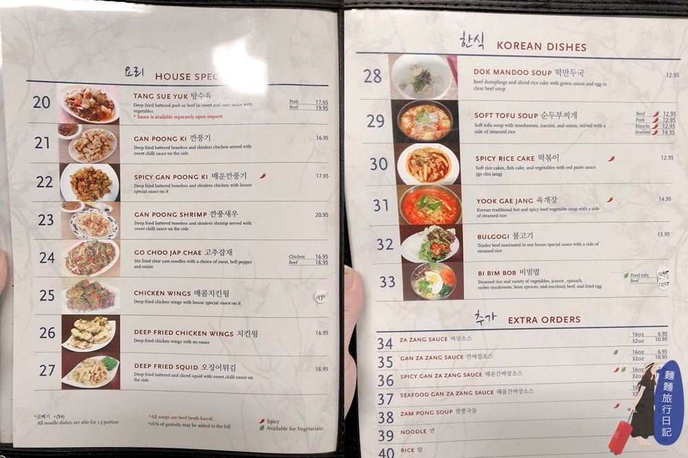 韓國人吃炸醬麵一定會點的糖醋肉、少部分的傳統韓式料理,例如年糕湯、豆腐鍋、辣炒年糕、蔬菜拌飯等,如果有小孩的話,菜單旁邊有辣椒提醒是否會辣唷~