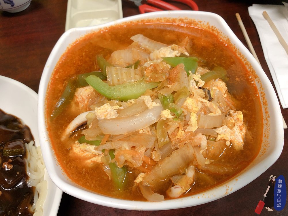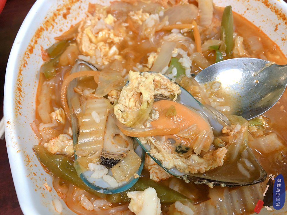 除了炸醬麵之外,我們還點了一碗辣海鮮湯飯,裡面除了滿滿的蔬菜還有加蝦子、魷魚、貝類海鮮唷!不想吃飯的話也有辣海鮮湯麵,我選的是湯飯!