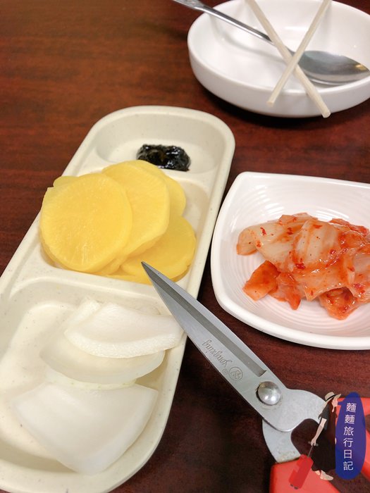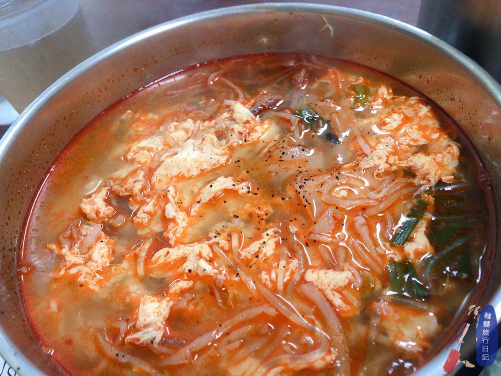 湯看起來雖然紅通通好像很辣,喝起來還好,但是因為加了很多蔬菜、海鮮,所以超級鮮甜好喝,加上一點點辣味,很棒,這在台灣的韓國料理店是不是叫炒瑪湯麵?