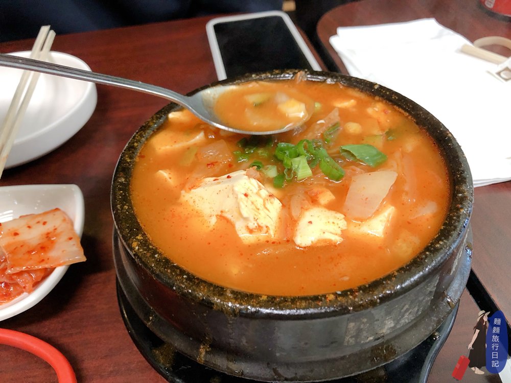 哈哈哈沒錯,還點了一碗韓國豆腐鍋,才4個人點超多,豆腐湯可以選牛肉、豬肉、泡菜或是海鮮,我選泡菜,裡面還有加南瓜、洋蔥等蔬菜,有附白飯!酸酸辣辣又熱呼呼的豆腐湯,超級下飯夠味!不要擔心我們點太多,我們都有吃完啊!波仔跟樂樂現在的食量非常的可觀啊!