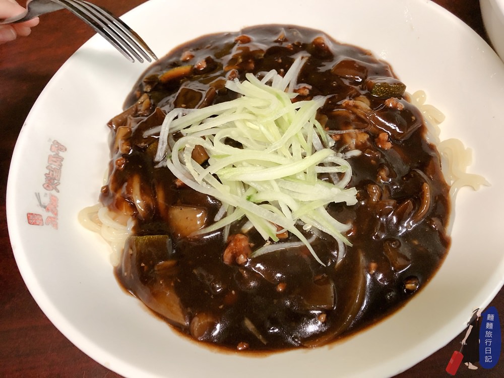 我們點了一碗一般的炸醬麵,很大一碗份量十足啊,裡面有豬肉末,醬汁裡有洋蔥,上面放黃瓜絲,韓國炸醬麵的醬都黑黑的,拌在一起看起來就髒髒的,但每次看韓劇韓國人大口大口速速速吸麵,吃得滿嘴黑咪馬就會不自覺的分泌無限唾液XDDD