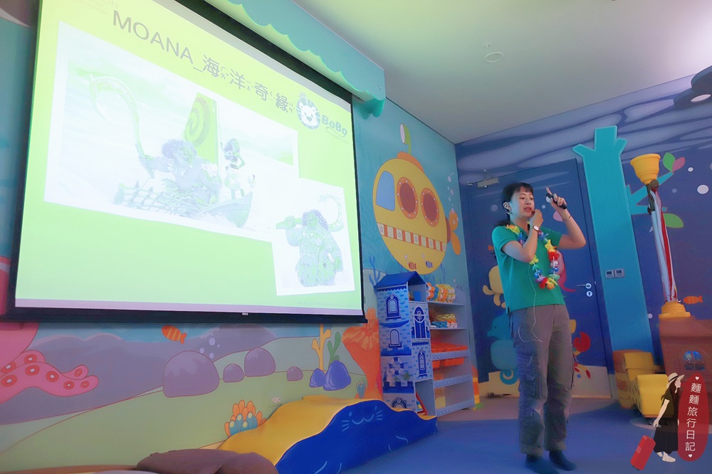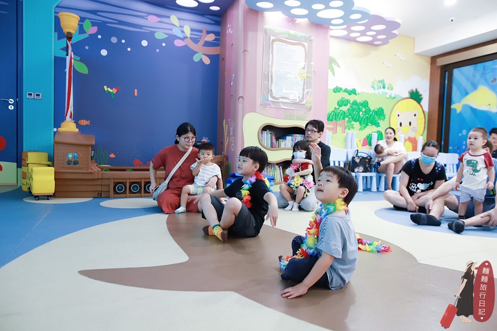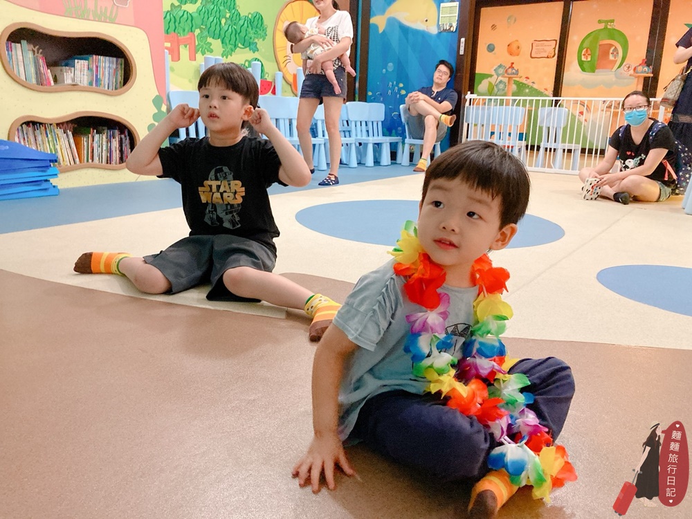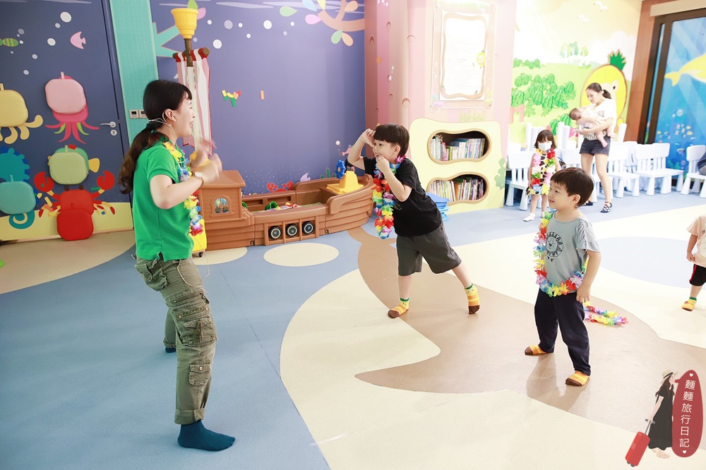 聽完故事就要站起來學跳舞囉~舞蹈動作對小朋友來說都很簡單,學完後會正式跳一遍喔!大姊姊都會一直在前面帶動跳,忘記動作也沒關係~~~辦理入住的時候櫃台會給你一張親子體驗活動表,聽說晚上還有睡衣趴捏~~~很多行程、很多活動,排得滿滿滿啦!(結果晚上去游完泳後兩隻體力不支,直接睡死XD)。