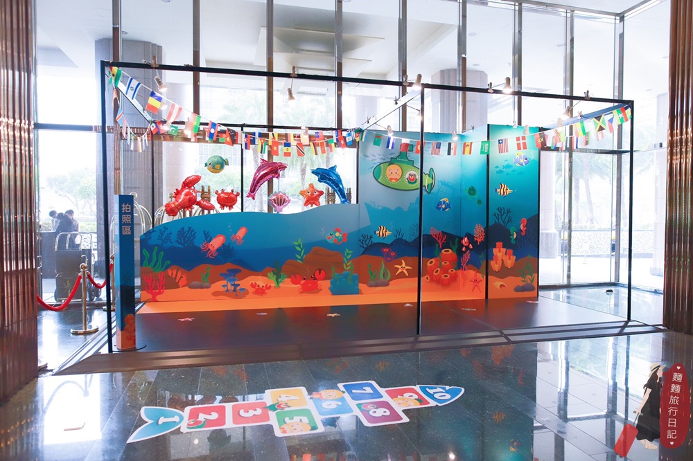 一樓旅客休息區對面就設計可愛童趣海底世界的拍照區、地上還有跳格子呢~辦理入住手續的時候小屁孩也玩得很開心。