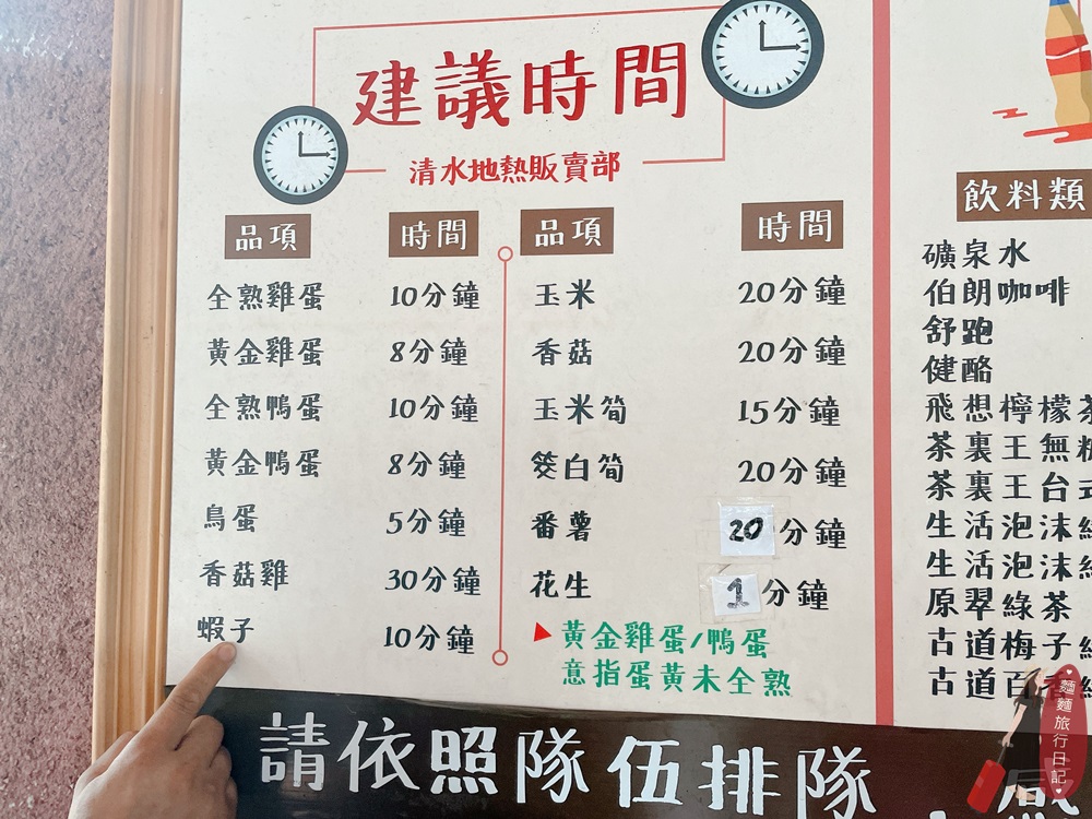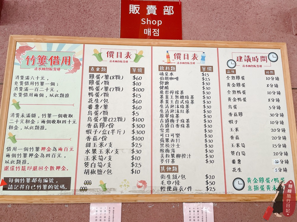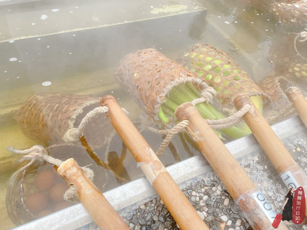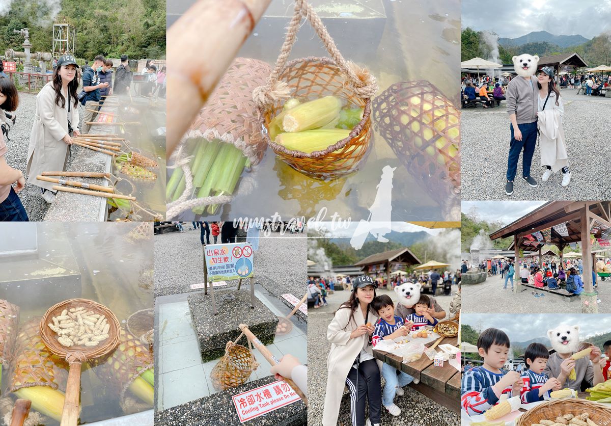 遊客中心有販售食材,大家也可以自己從山下買帶上來喔~食材選購推薦好煮得像是雞蛋、玉米、玉米筍、花生這類,肉類跟海鮮要盡量避免!另外溫泉水煮食不能用塑膠網子下水喔,可以到遊客中心租借煮食材的竹簍,租借竹簍需付200元押金,歸還竹簍會退還,消費滿60可免費租一個竹簍!