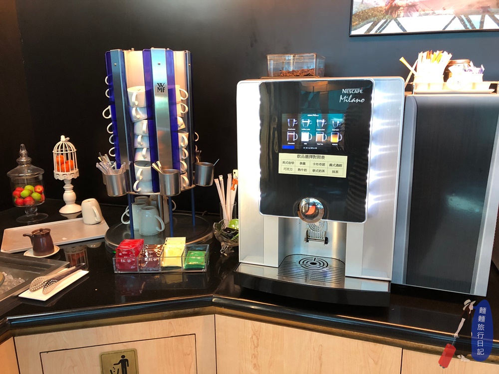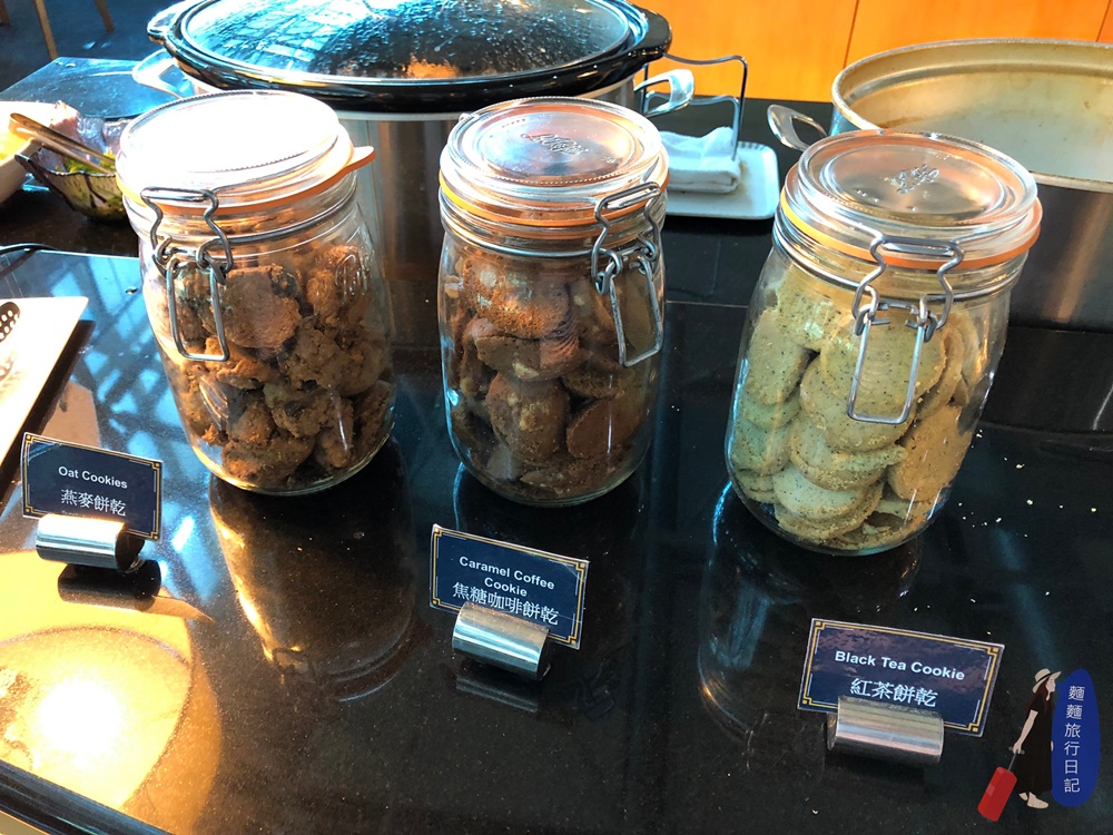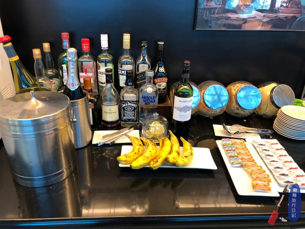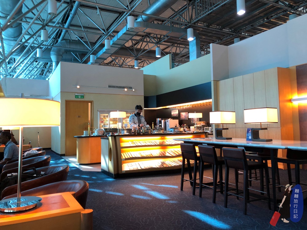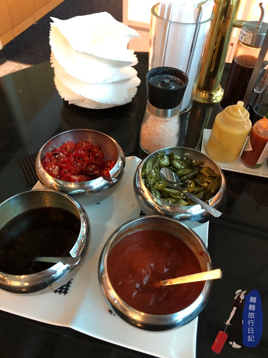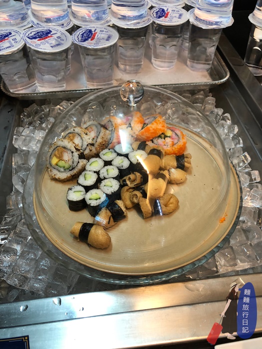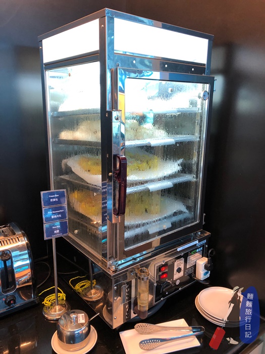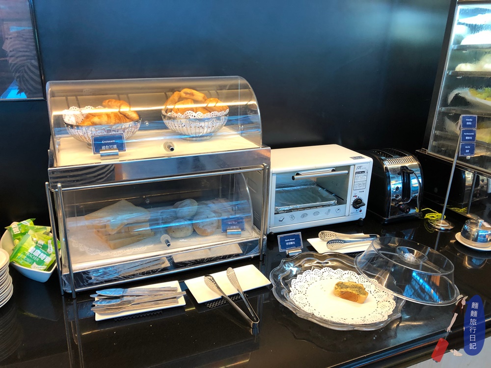 吧檯高腳椅區後面就是新航的自助餐飲區啦~~~ 很小巧但式餐點也是不哩啊多捏!自助區是一個ㄇ字型,然後中間有一個中島,所以走進去繞一圈左右都有食物的概念。