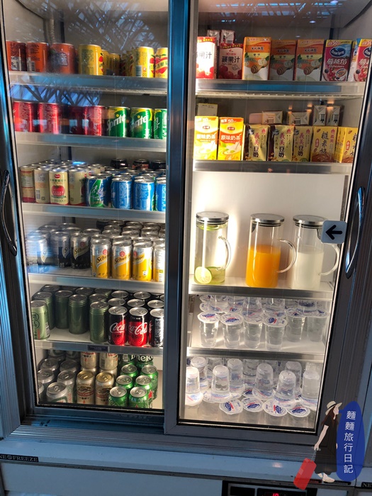 自助吧走進去左手邊先是冰箱櫃,裡面有飲料、各類果汁、水杯等。