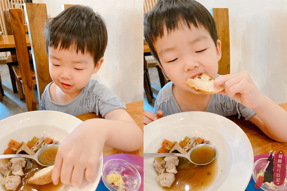 樂樂更愛把麵包沾著湯一起吃呢~湯裡料也是滿多的,各種蔬菜在裡面。