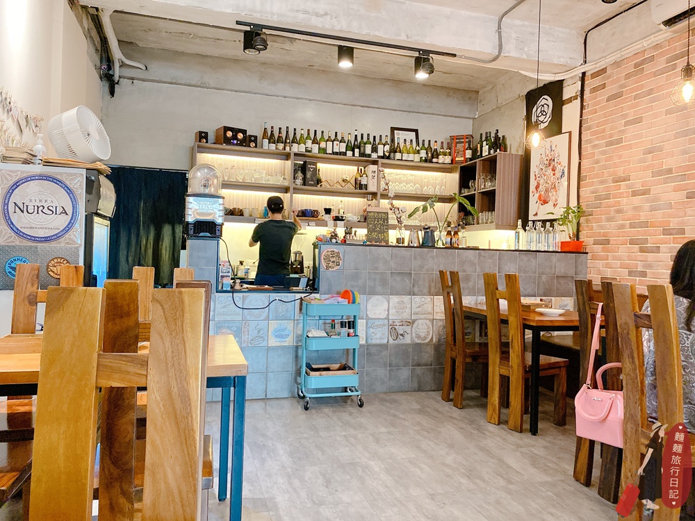 餐廳環境帶點工業風~又有點溫馨!點餐櫃檯也是製作飲料的吧台區,除了各式各樣的杯子,還有不少的酒類,小冰箱裡還有酒精飲料可以自己選。