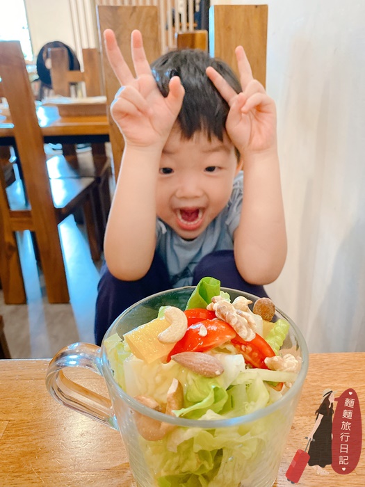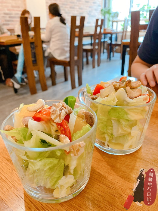 慢半拍餐館的生菜沙拉很可愛,裝在透明的玻璃杯裡,一杯一杯的,使用的蔬菜是水耕農場種植的特殊生菜種類,新鮮的生菜加上清爽的油醋醬汁很開胃,沙拉上還有堅果喔~