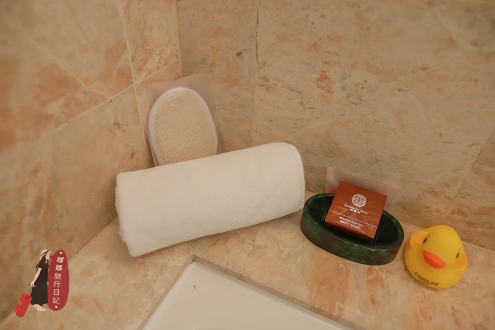 浴缸旁邊竟然有一隻可愛的Conrad小鴨,然後很貼心的有去角質刷跟泡澡用的浴鹽,每天都會補喔!晚上等兩隻小朋友睡著後,可以好好的鬆一下了是不是~(小心生第三胎)(抖)