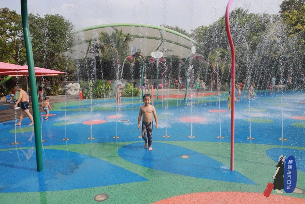 不想玩水的爸媽也可以在一旁的乘涼區休息~(設計得非常通風,在酷暑的天氣裡坐在那邊居然有涼爽的感覺!!超威~)這麼棒的免費玩水點,就連許多新加坡人假日時也會帶著小孩來!波仔跟樂樂在這裡已經玩瘋了~