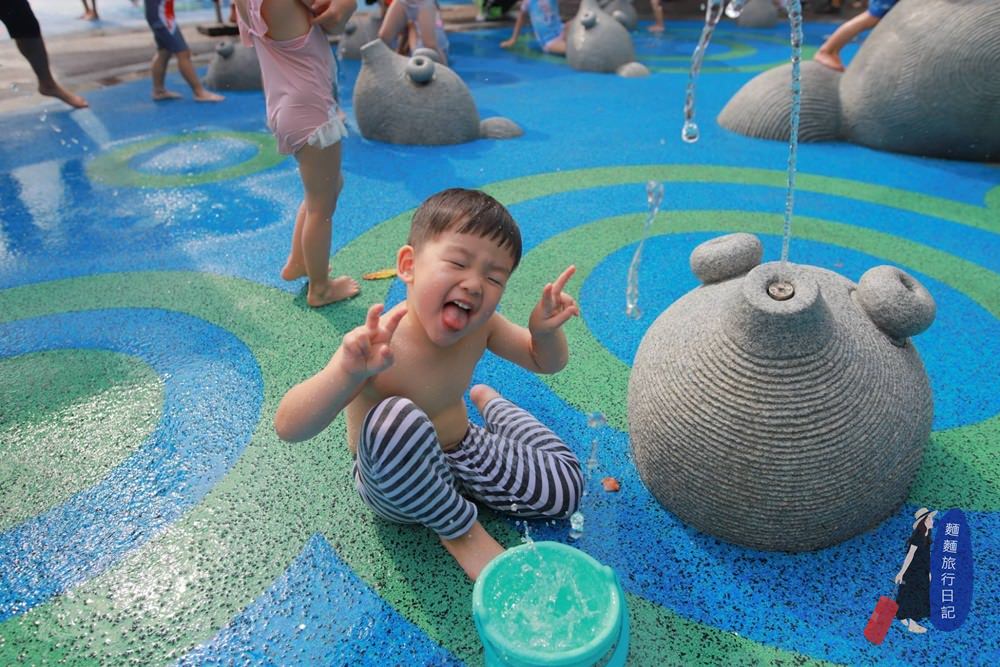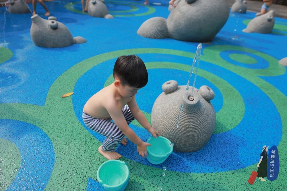 而且更貼心的是戲水區有分大小孩跟小小孩,波仔奔去的是給比較大的小孩玩的,村長有看到現場也有大人跟小孩一起玩瘋(偷說還有肌肉猛男白人爸爸喔我一直偷看),噴水柱灑出來的水量時大時小的噴出來,水柱上面的花朵容器如果裝滿水後,還會往下倒喔~