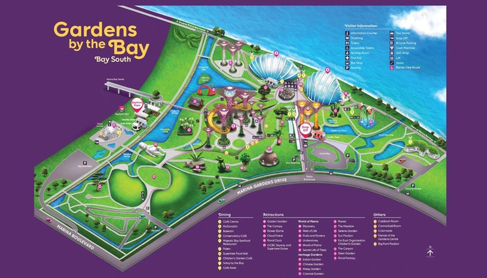 濱海灣花園超級大!可以在這邊走走逛逛一整天~~地圖上那兩個很像貝殼的建築物就是花穹跟霧林冷室喔!村長是從金沙酒店走過來的,但有點失憶從哪個方向走過來了!哈哈哈,我記得是從左邊的橋走過來的?!!村民們去的時候可以研究看看~~~