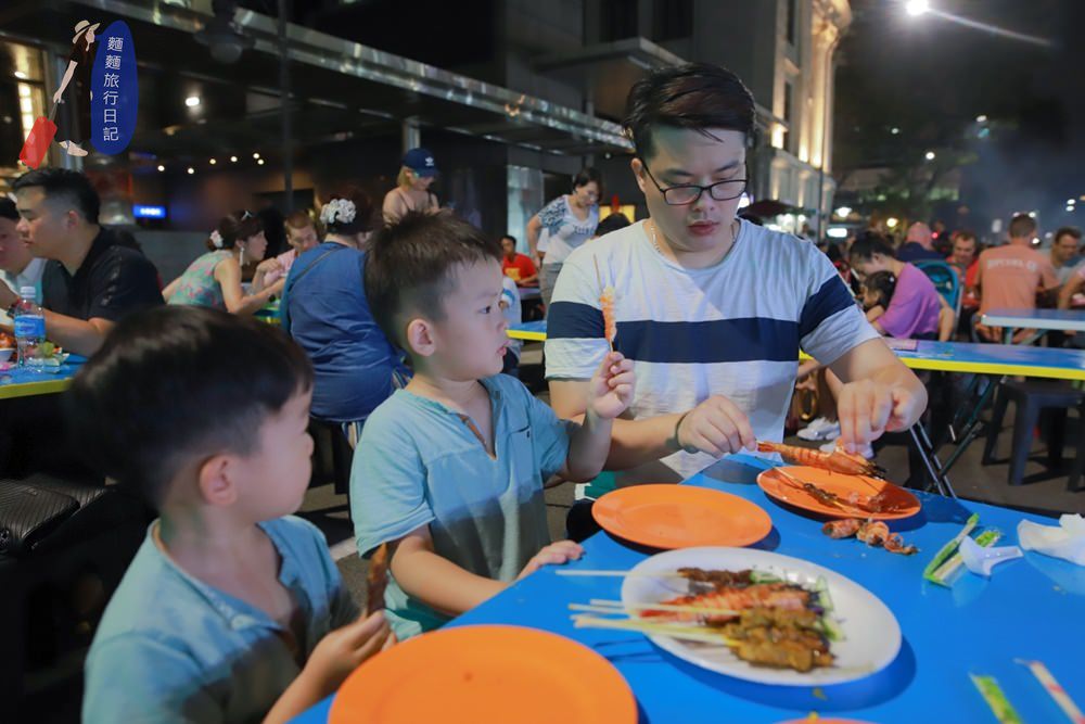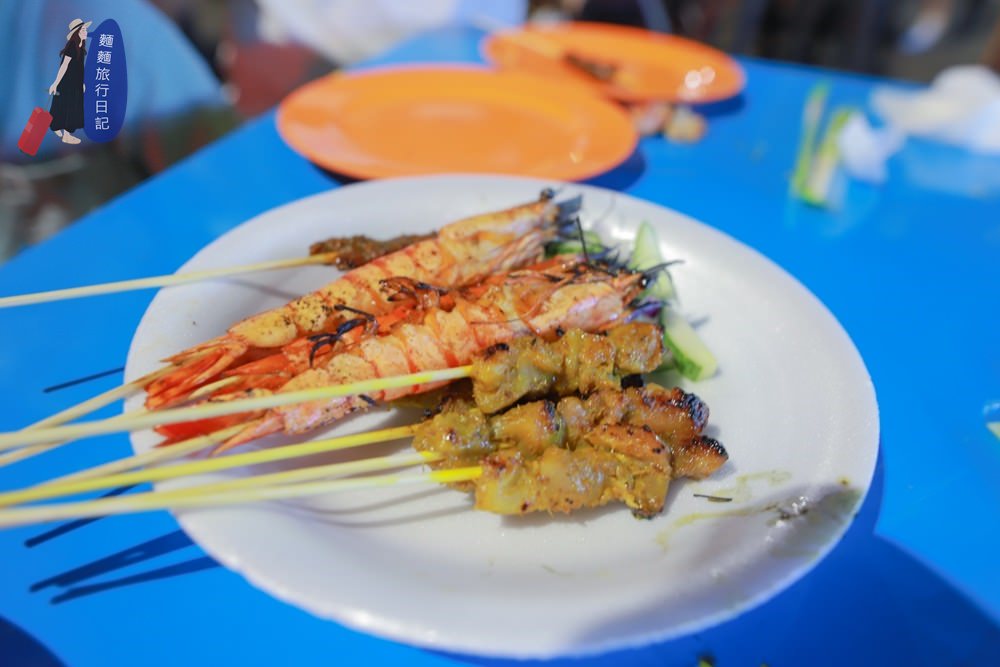 通常會有套餐可以點,可能就是肉串配上幾隻蝦,走在沙嗲一條街會有很多攤販拿著菜單在招攬生意,村民們可以選擇適自己的套餐組合,波仔&樂樂表示:我們從不自己吃蝦,因為我們只吃爸爸幫我剝的蝦!哈哈哈。