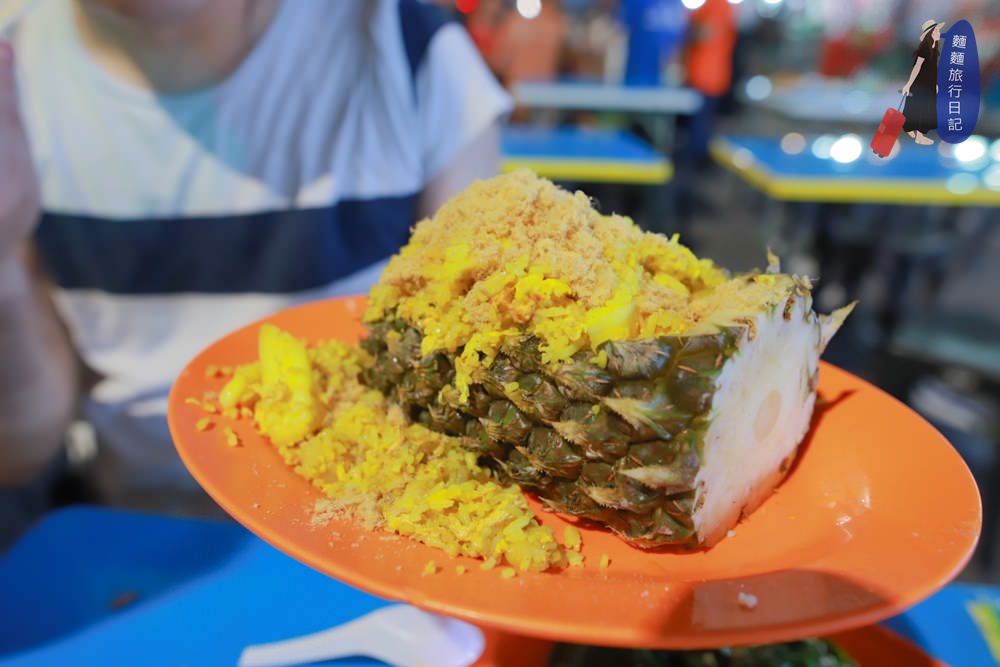 帶著兩隻不管吃哪一餐,都必須點個管飽的餐點才行,畢竟小孩正在長大,所以村長就點了一個鳳梨炒飯,看著堆在鳳梨裡一粒粒金黃色的炒飯,好香阿!南洋風味好開胃~每口飯都吃的到鳳梨的果香味~酸甜好滋味上面還堆滿肉鬆,鹹香甜香,讚讚!(偷說用整顆鳳梨當容器真的也是很狂啦)