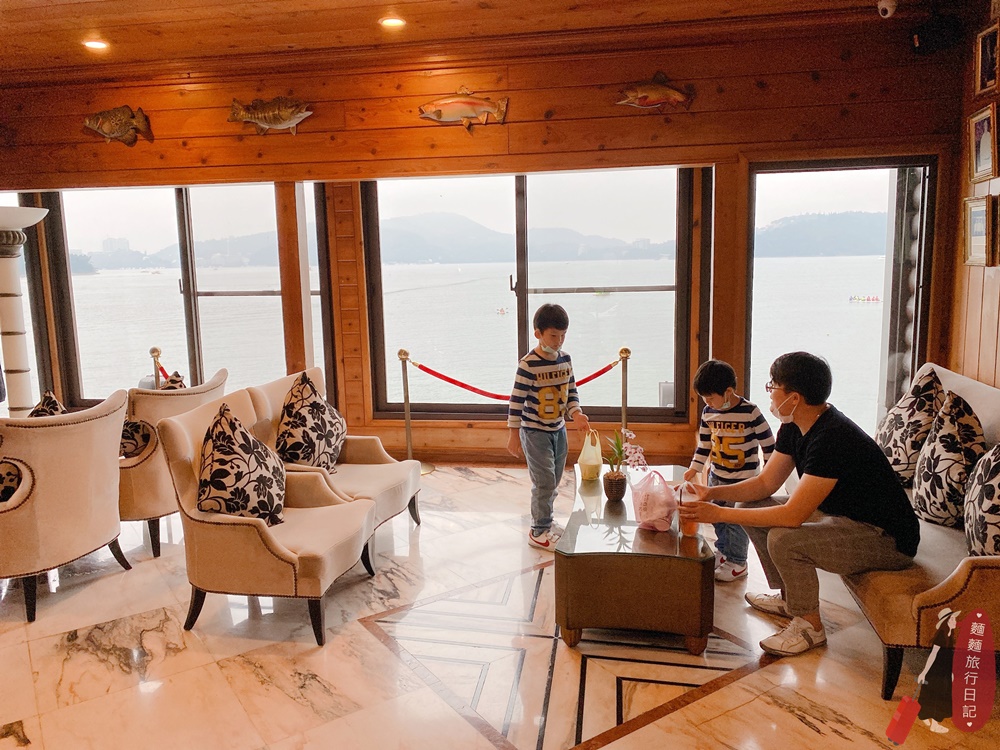 在3樓跟5樓的地方都有可以觀賞日月潭湖景的景觀窗休憩區!大猴帶著兒子們狂吃剛剛逛老街買的小吃,根本沒人在認真看日月潭湖景。🤣