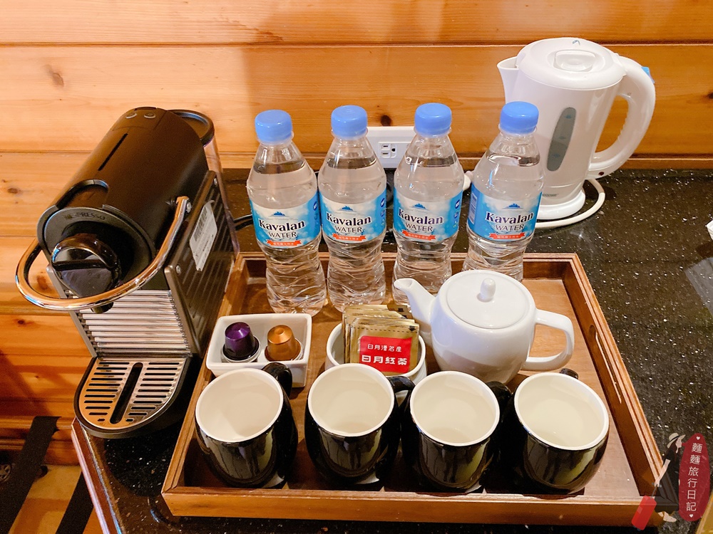 茶水櫃上有一台膠囊咖啡機、礦泉水、日月台紅茶,跟馬克杯們。