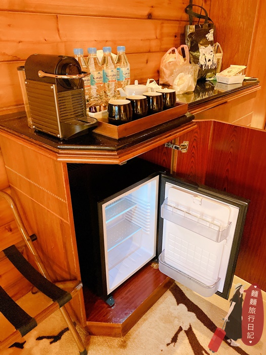 床前的茶水櫃空間滿大,放了剛剛買的食物們很很寬廣,茶水櫃下方有一台小冰箱。