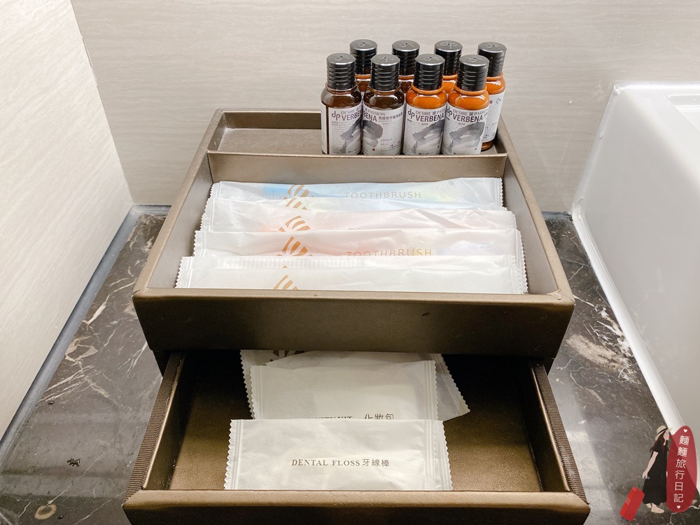 洗浴備品都分門別類整齊的放在檯面桌上型收納櫃裡。
