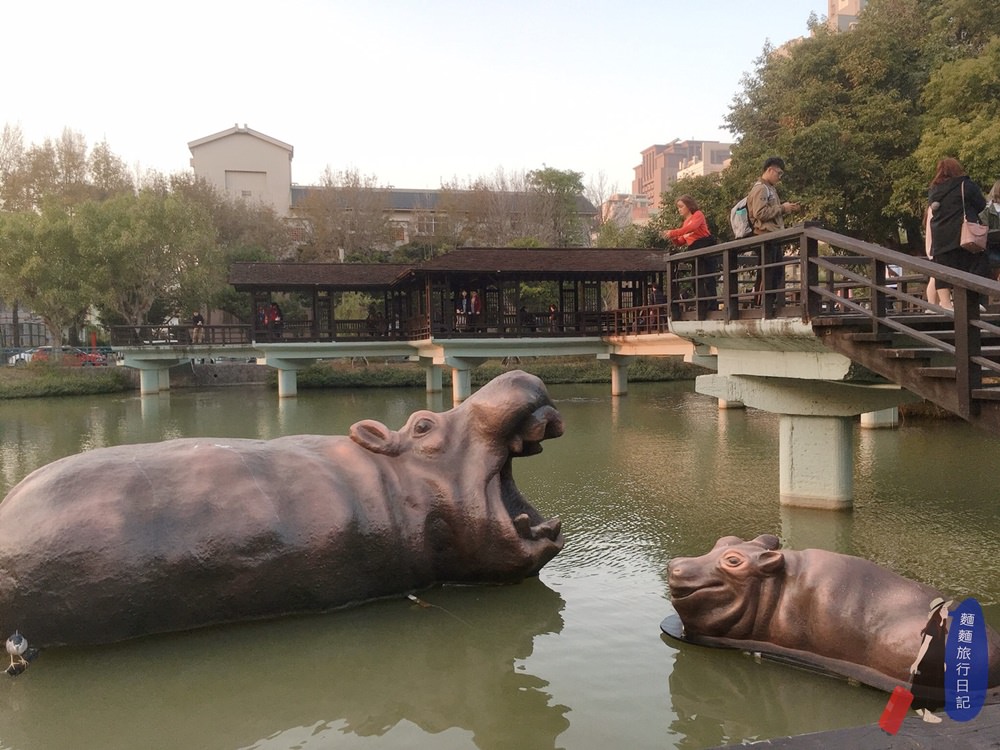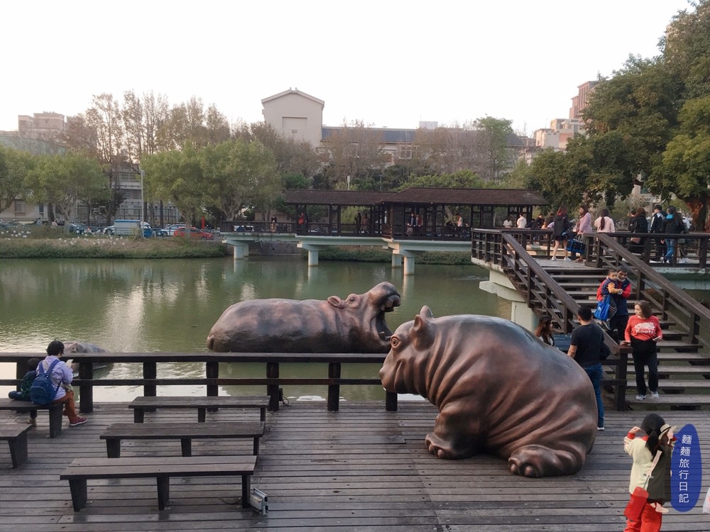 新竹公園的湖面總共有4隻河馬,藝術家以新竹動物園的人氣動物河馬樂樂為模特,製作了跟樂樂一樣可愛憨厚的河馬,河馬表情生動,每一隻動作表情都不一樣。