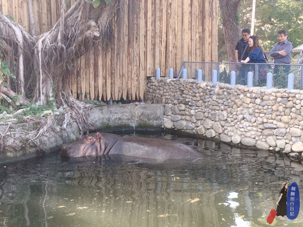 但是我去的時候河馬樂樂把自己泡在水池裡,是整隻泡進去不肯露面連頭都看不到,河馬樂樂在水裡閉氣時間為2分鐘,可以靜靜等個2分鐘河馬樂樂就會抬起頭來換氣囉!換氣時冒出水面的樂樂,換完氣又馬上沉入水裡了😂