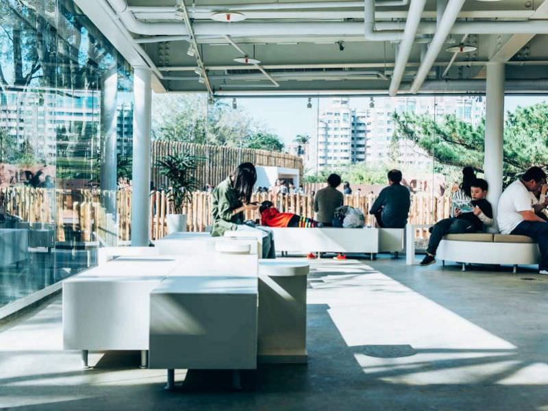 出園後新竹市立動物園1號出入口旁邊有一個親子餐廳森林食堂,白色簡約的造型搭玻璃落地景觀窗,可以一邊用餐一邊看到動物園裡的草園動物區裡的動物。