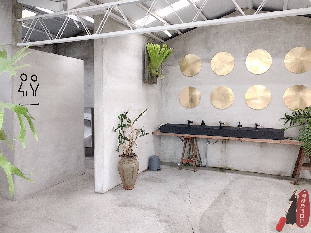 廁所總不能開放式沒有牆吧,這裡也是清水模牆面設計,搭配綠色植物,洗手台的設計也很好看,不是用一般一整面的鏡子,而是一個個的圓銅鏡,設計感十足,我看到很多人還特別跑來廁所拍照!