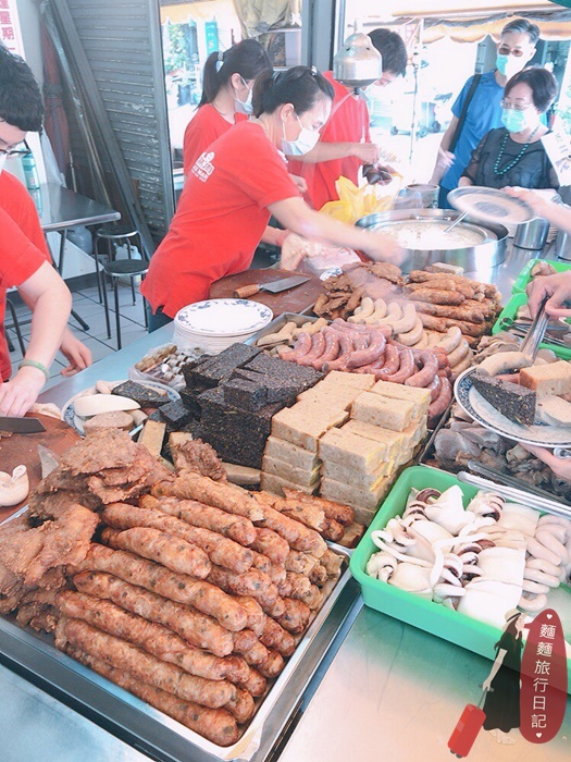 剛吃飽戰力薄弱,雖然很想買樣都夾,但是胃只有一個啊啊啊!我們夾了蟳粿、紅燒肉、豬肝跟生腸,蟳糕是在中南部比較常見的古早味食物,用豬肉、魚漿跟荸薺攪拌後蒸熟做成,下面一層黃色是蛋黃,吃起來很像粿,但又有很足的豬肉、蛋香味,加上荸薺的口感,真的很好吃啊,我很喜歡!紅燒肉也很好吃,豬肝就一般般囉~~~我第一次吃到生腸,口感脆脆的很特別,後來才知道原來生腸是豬的子宮呀😅怕爆,黑人魯熟肉連醬汁都很講究,每天用高湯、糖、醬油膏、蒜蓉煮好,搭配哇沙咪,沾醬整個非常刷嘴,會讓人忍不住一口接一口,停不下來,魯熟肉我最愛紅燒肉跟蟳粿,必點!