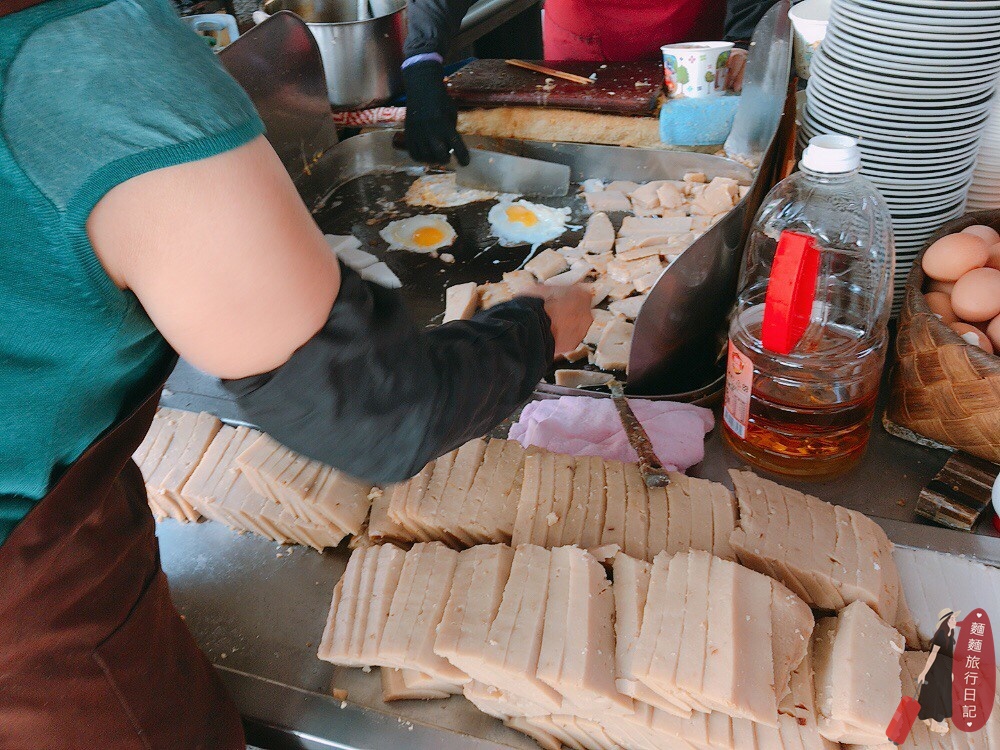 炊好的粿就這樣被切成一小塊一小塊的放在煎板上煎,一定要加一顆蛋喔~~~其實煎粿就是蘿蔔糕啦~~~為什麼是咖啡色的呢,因為加了油蔥酥跟醬油才會變色,所以大家也會叫咖啡色的為油蔥粿。