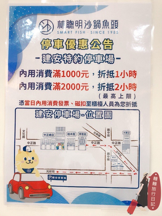 所以村長來嘉義第一個晚上就迫不及待來吃林聰明沙鍋魚頭啦,林聰明沙鍋魚頭在嘉義市區中正路上,不好停車,但是沒關係林聰明沙鍋魚頭有提供特約停車場喔~開車的人可以停在光彩街的建安停車場(文化郵局側門)。