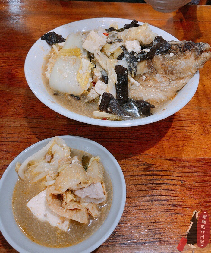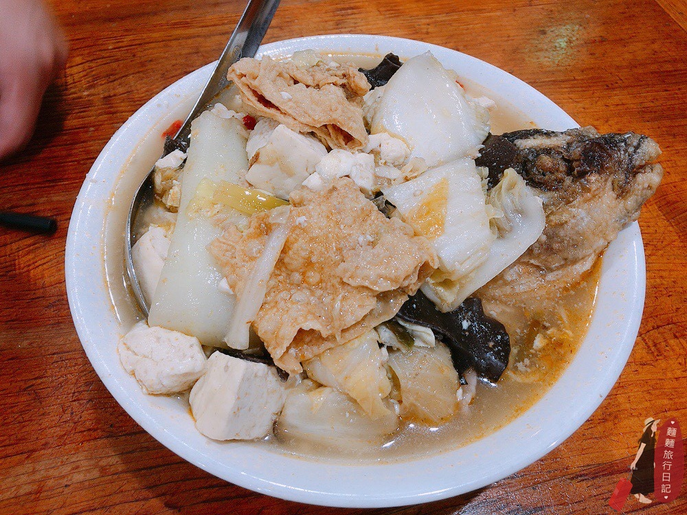 沙鍋菜裡面有白菜、豆腐、木耳、豬肉、豆皮,料超多超滿,真的是真材實料啊!加上一顆魚頭,傳統手路菜真的超級豐盛!湯喝完還可以續,把碗端去給工作人員,他們就會幫你加湯了,這樣兩人吃非常足夠,根本超飽!