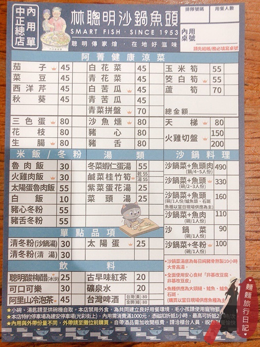 林聰明沙鍋魚頭的好處就是不管你是一個人、兩個人、還是一群人來,菜單上都有依不同的人數的沙鍋魚頭可以選擇唷!只是如果點單人份,只會提供魚肉而不是一整顆魚頭喔!不想吃魚肉的也可以單點沙鍋菜就好,很客製化的菜單,而且除了沙鍋魚頭還有一些涼菜、雞肉飯、冬粉可以點欸!