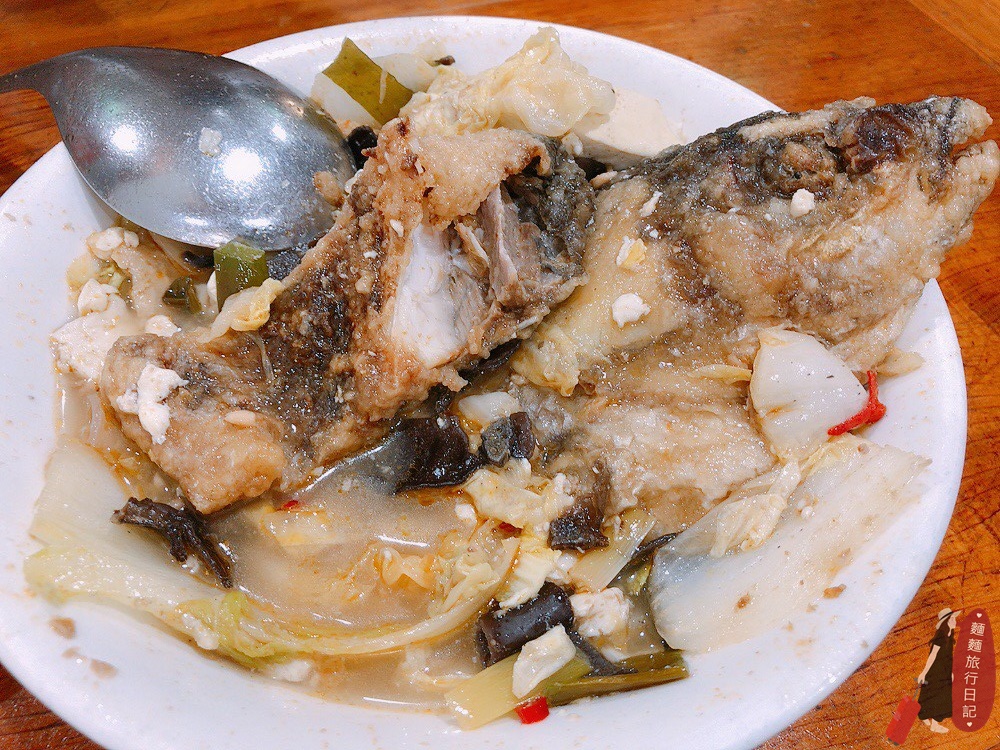 魚頭是先裹上麵粉油炸放在旁邊,有人點餐的時候就會把魚頭跟大鍋菜組合在一起,這顆魚頭的魚肉還真不少,肉非常清甜細緻,我原本以為會有點油膩,而且我很不討厭吃炸過後又泡進湯裡的那種軟爛口感,沒想到魚肉很好吃,意外地吃了很多魚肉還覺得非常好吃!