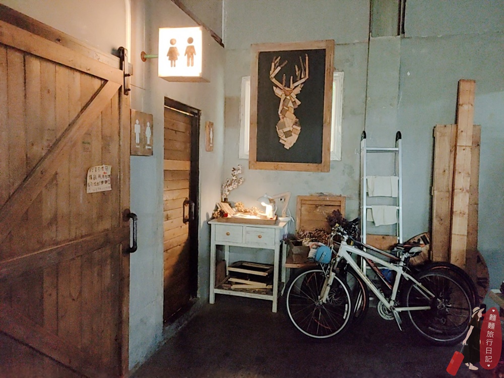 餐廳走到最底就是廁所啦~外面一樣用很多木頭裝飾捏,還停了兩台腳踏車,莫非員工都騎腳踏車來上班嗎?!