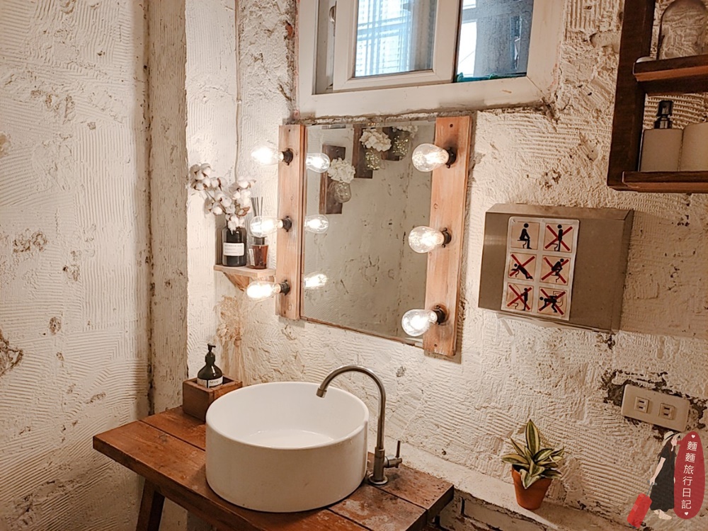 廁所裡用的是米白色牆面,好像用刮刀還是什麼工具刮出一條條不平整的模樣,木桌放上圓形的洗手台,還滿可愛的!
