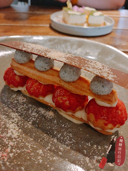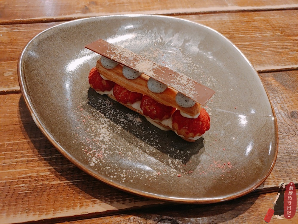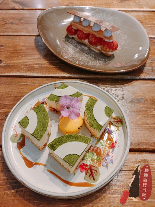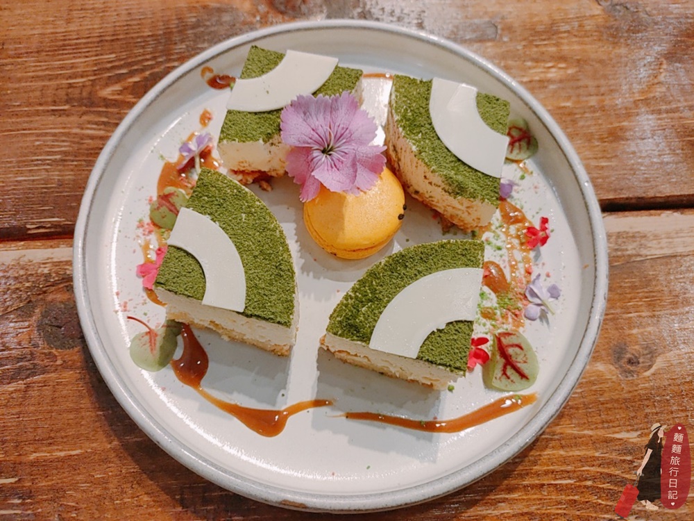 窗櫺其實是古早人房子的窗戶名字,甜點設計也跟窗戶一模模一樣樣,這道甜點超級適合跟村長一樣不愛吃甜食的人,因為窗櫺是不甜的甜點微酸的好滋味,讓我念念不忘啊!底部是餅乾,上層的蛋糕體是生乳酪蛋糕,濃郁的酸爽勁十足,最後撒上台式的抹茶粉,搭配白巧克力,旁邊的醬料是焦糖化牛奶糖,跟石竹花、綠葉紅酸膜點綴裝飾,超美又好吃的甜點!