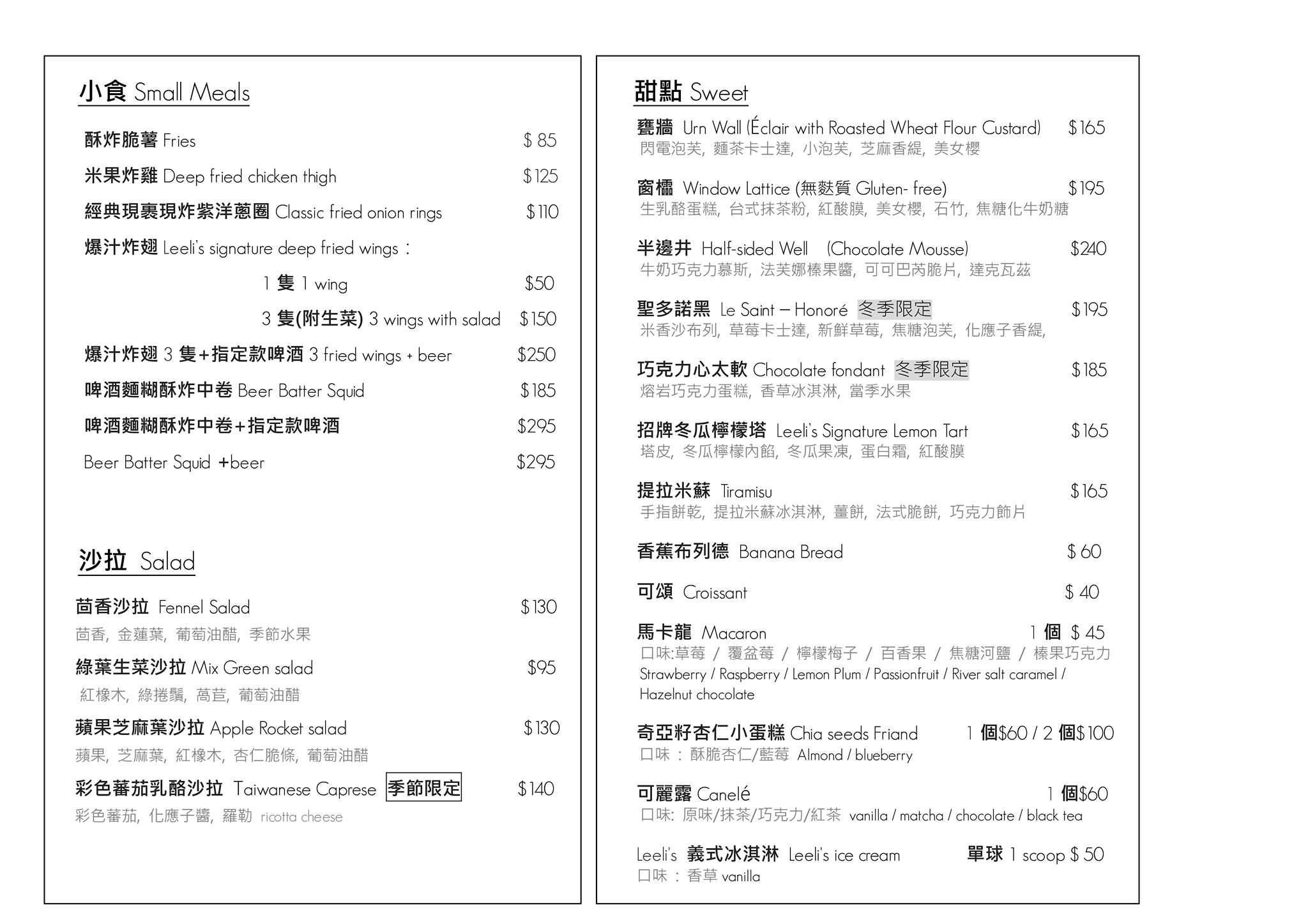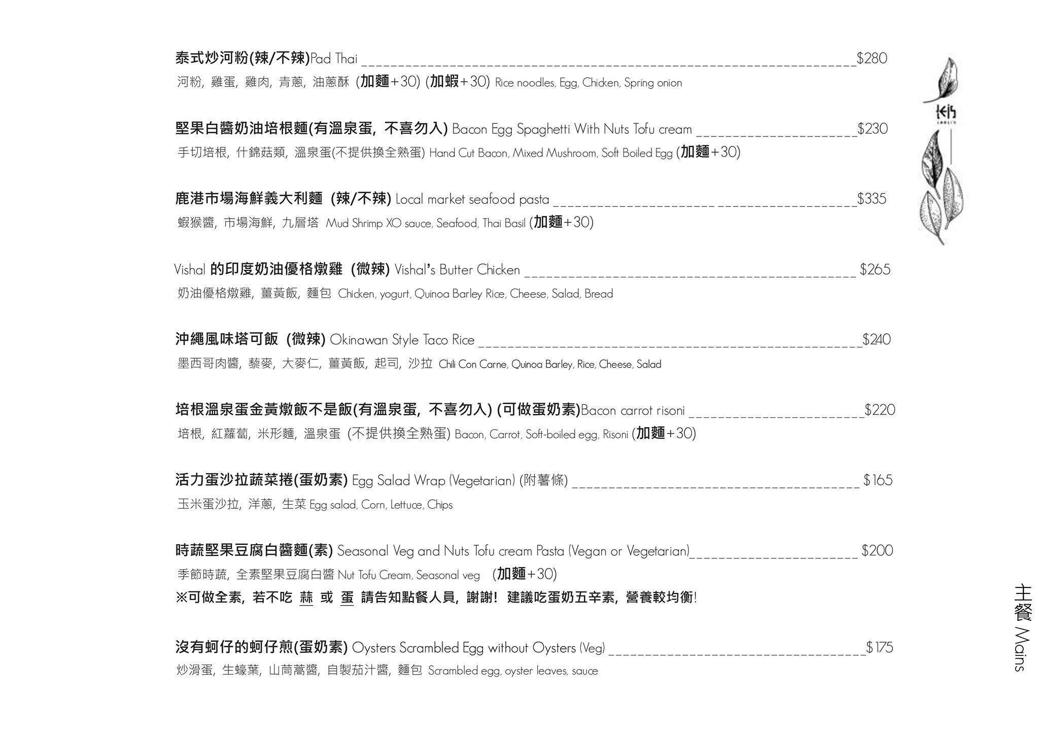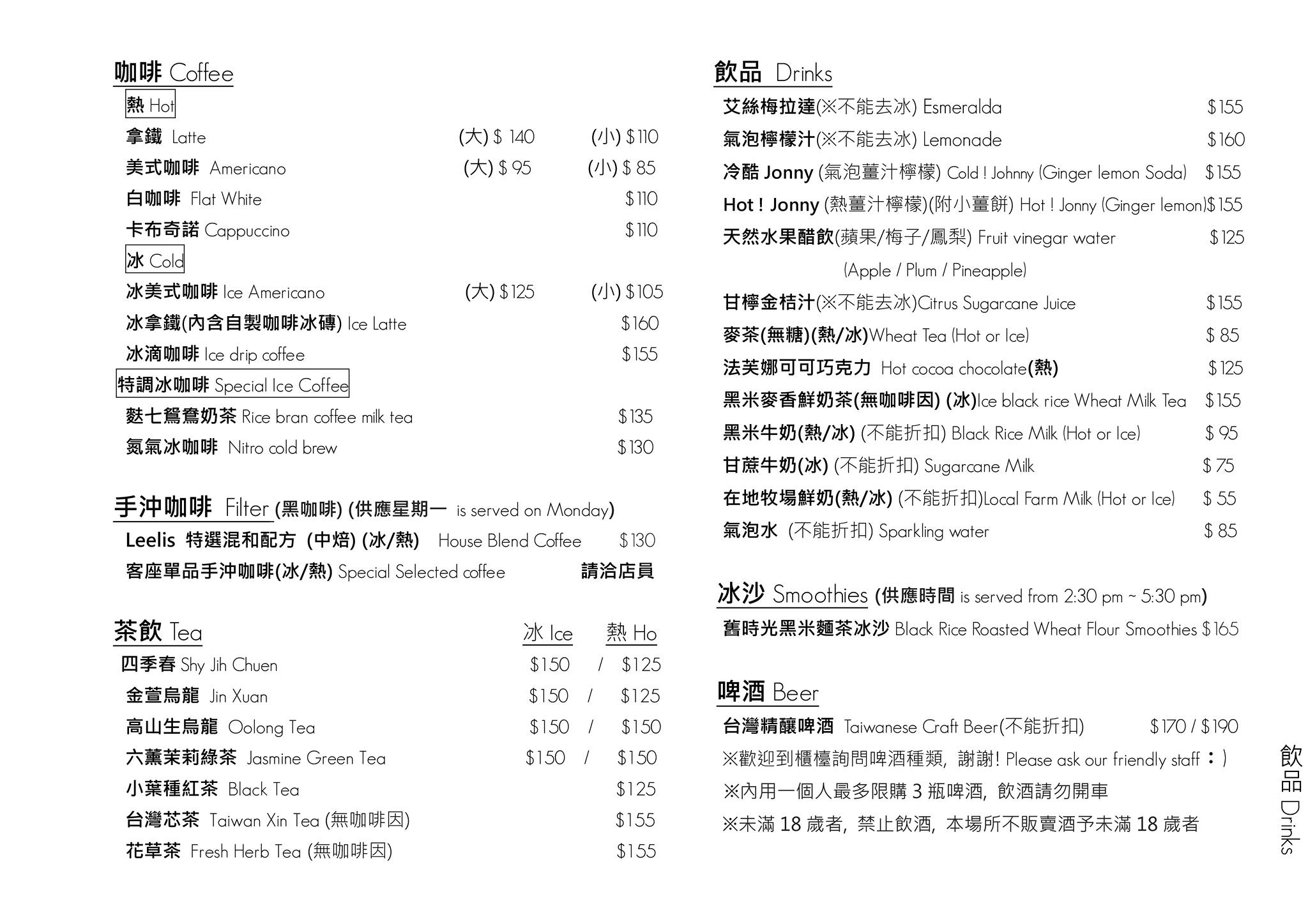 飲品部分除了各式各樣的咖啡也有茶類、果汁、果醋、鮮奶茶等,很豐富,這份菜單是早午餐/下午茶菜單,晚上的菜單無港款喔!