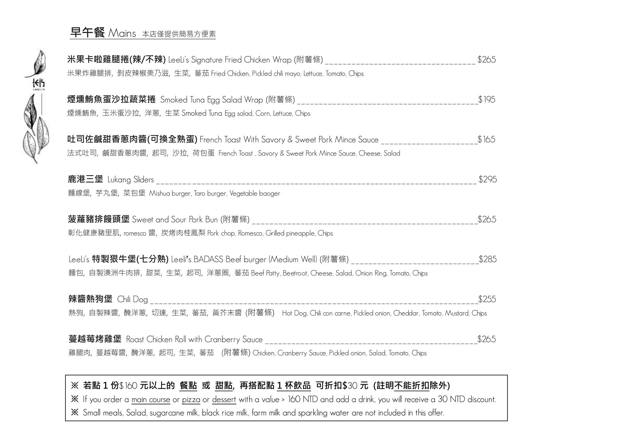 早午餐系列將來鹿港必吃的特色小吃麵線糊、芋丸、菜包融入菜單裡,推出了鹿港三堡早午餐,這頁偏輕食類有捲餅、漢堡、饅頭,除了在地特色的小吃融入料理外,食材都是用鹿港在地農產品、酪農產品等。