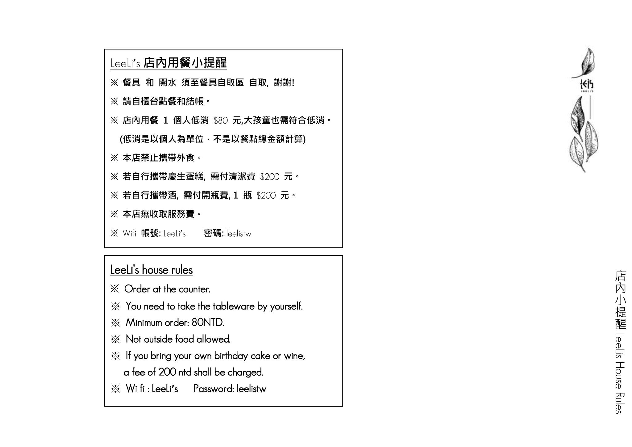 菜單上有很清楚的店內小提醒喔!還滿貼心的,人多的時候可以不用詢問店員,一目了然。