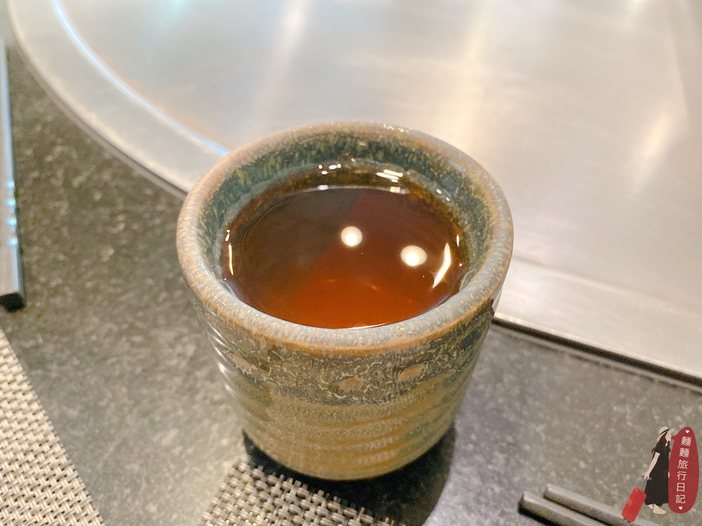 上品苑的用餐模式也跟夏慕尼一樣,主餐會在鐵板吧台區用餐,吃完後移到一旁的桌椅座位區享用甜點跟飲料,入座後先送上冰的烏龍茶,我覺得冰蕎麥可能會比較適合。
