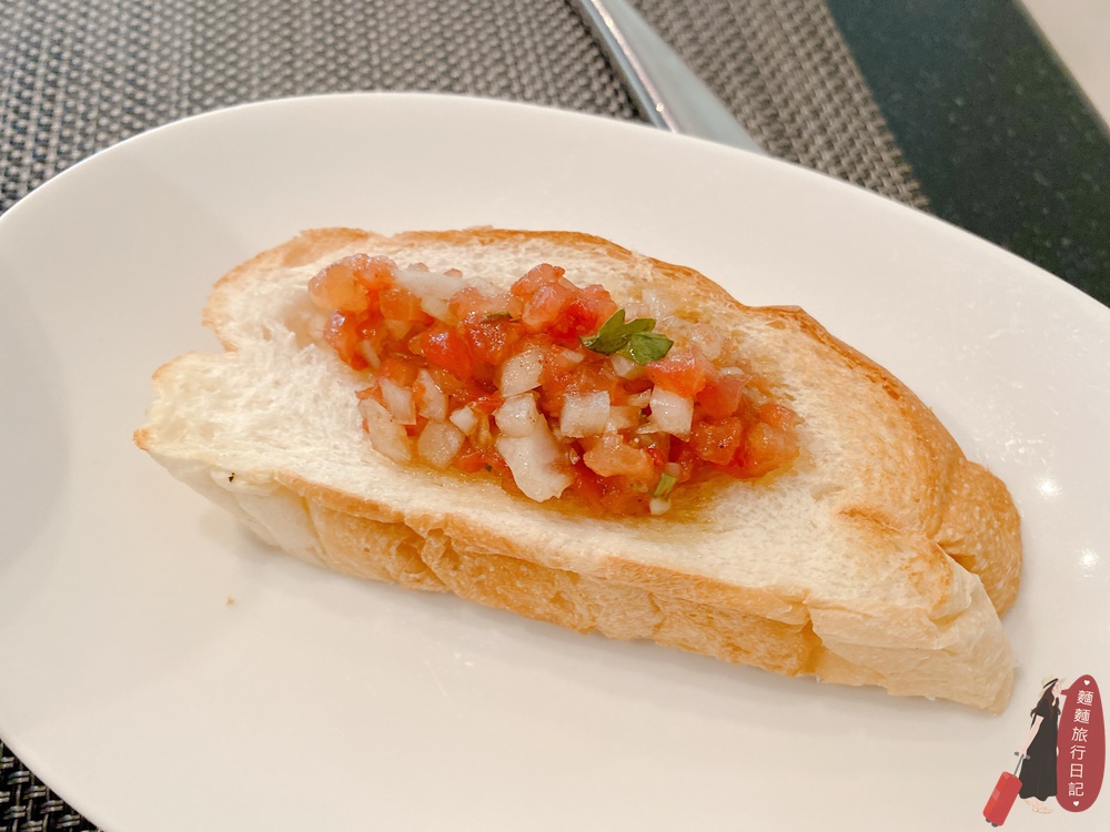 湯都還沒喝完馬上又上了剛剛在鐵板上煎熱的麵包,麵包吃起來軟嫩熱乎,麵包上面有莎莎醬,配著濃湯一起吃很讚啊!有人跟我一樣每次吃麵包都一定要沾著湯一起吃嗎?!!