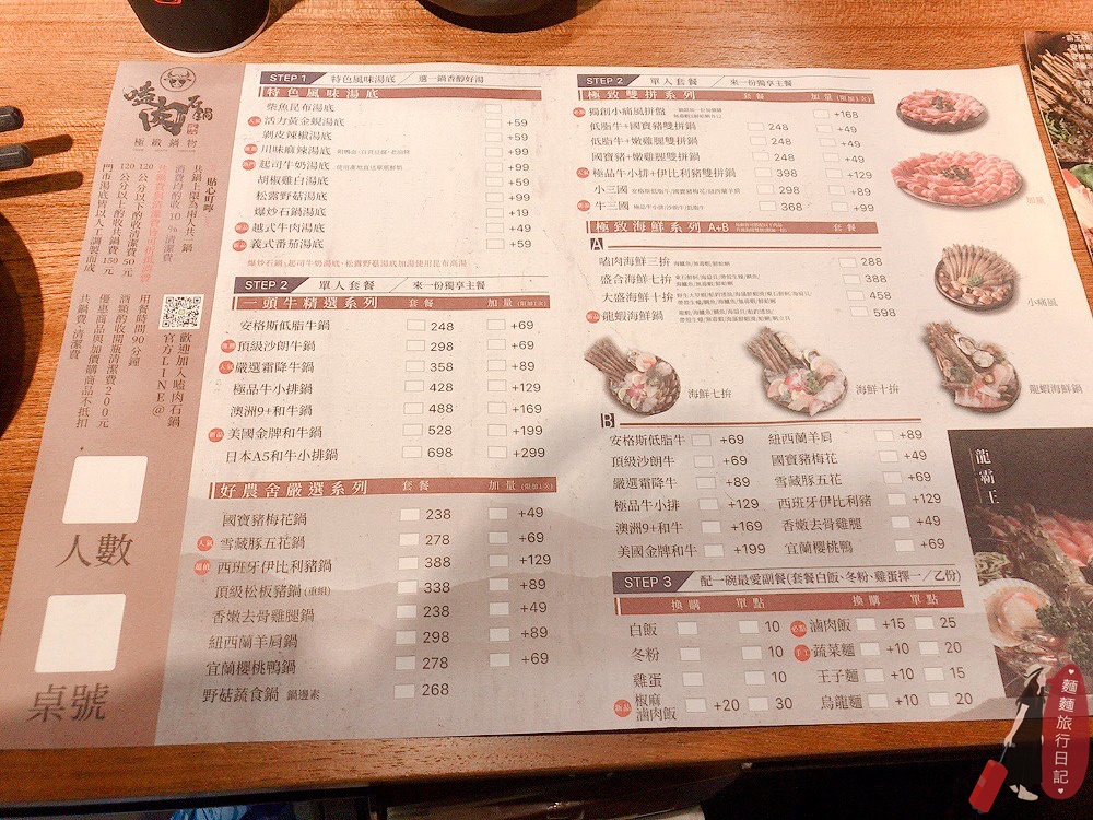 嗑肉石鍋是一人一鍋的套餐式火鍋,菜單上的步驟很清楚,先選湯底,嗑肉石鍋的湯底除了基本昆布湯底外,還有另外九種超級獨特的嘉價湯底可以選擇,比較特別的像是剝皮辣椒湯底、胡椒雞白湯、松露野菇湯、越式牛肉湯、義式番茄湯等,選好湯底後、再選主餐就看你想吃牛還是想吃豬還是想吃海鮮啦,最後一個步驟就是選副餐啦!副餐有白飯、冬粉跟雞蛋擇一,也有滷肉飯、椒麻滷肉飯、烏龍麵、手工蔬菜麵等可以換購。