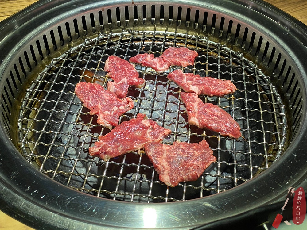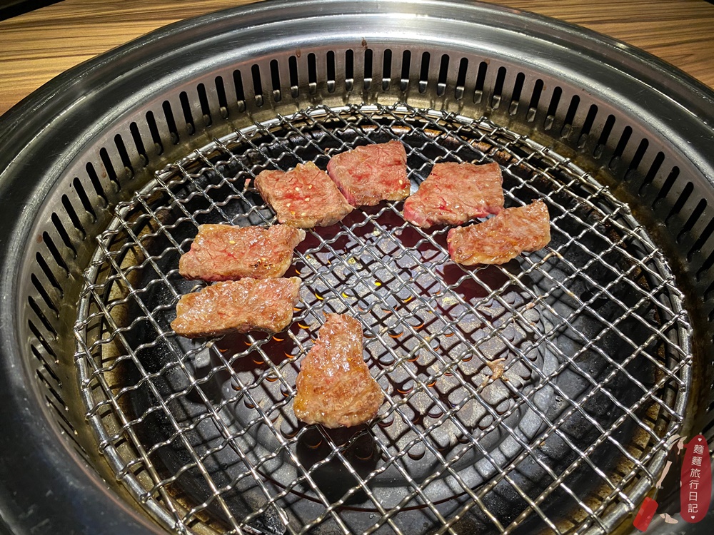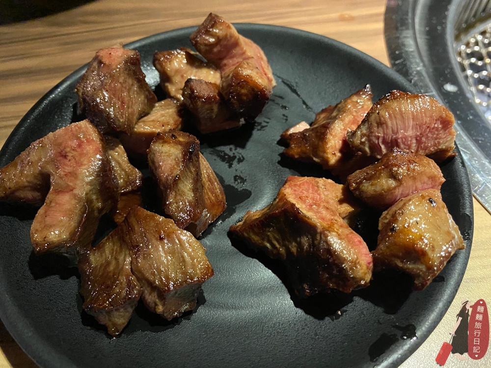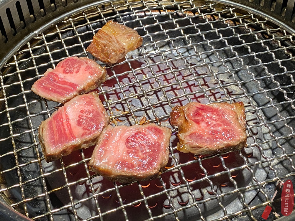 一塊塊的金磚牛排放上烤網後,表面烤出酥脆的顏色與焦香味後,牛肉裡面還帶著粉嫩色的樣子,也太美了吧~~~金磚牛排應該是當天晚上排名第二我最愛的肉了,表皮焦焦脆脆,多了一股焦香味,因為油脂多所以吃起來超、軟、嫩、歐買尬!超級好吃!