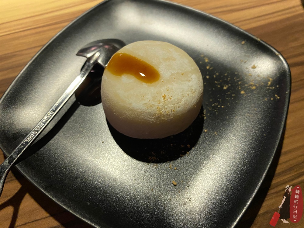 吃飽喝足後,最後每個人都會有一份甜點喔,甜點是麻糬冰淇淋,上面淋的是黑糖醬,還撒了黃豆粉~