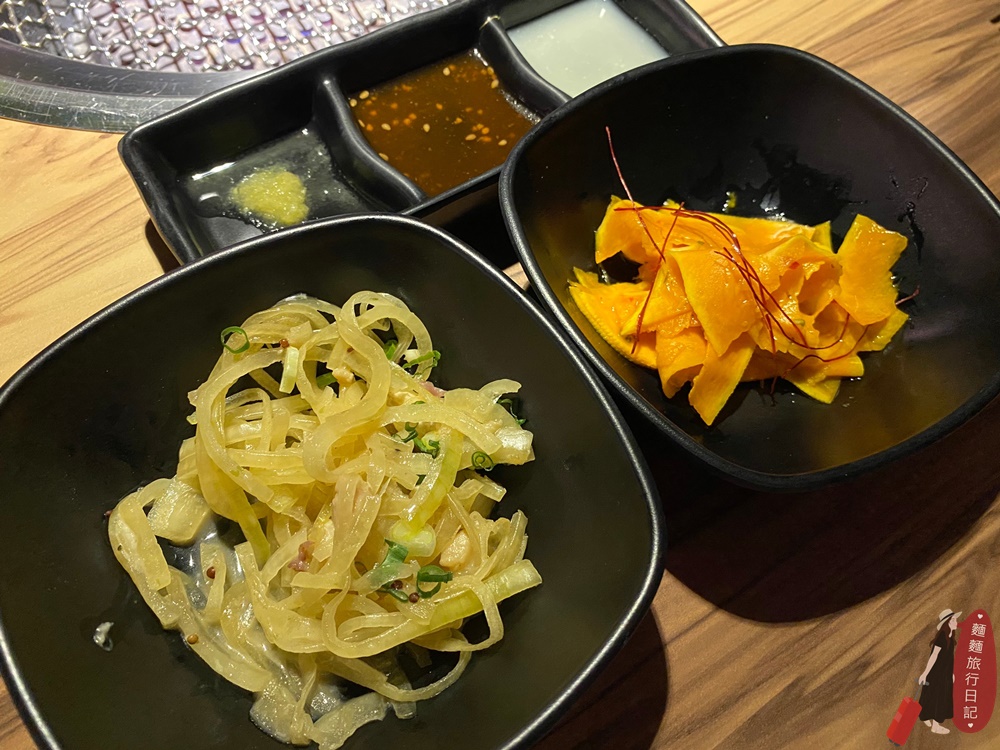 點完菜後店員會送上免費招待的開胃小菜,分別是香茅漬南瓜跟山葵洋蔥,兩款小菜都滿好吃的,南瓜的口感很清脆,酸酸甜甜的頗開胃,吃起來居然意外的像青芒果(誤);山葵洋蔥則是洋蔥辛甜加上山葵的嗆辣,也是很好吃欸!忍不住一口接一口。小菜後面是等一下要沾肉的醬料,最右邊是檸檬汁、中間是特製燒肉醬、最後是野山椒。