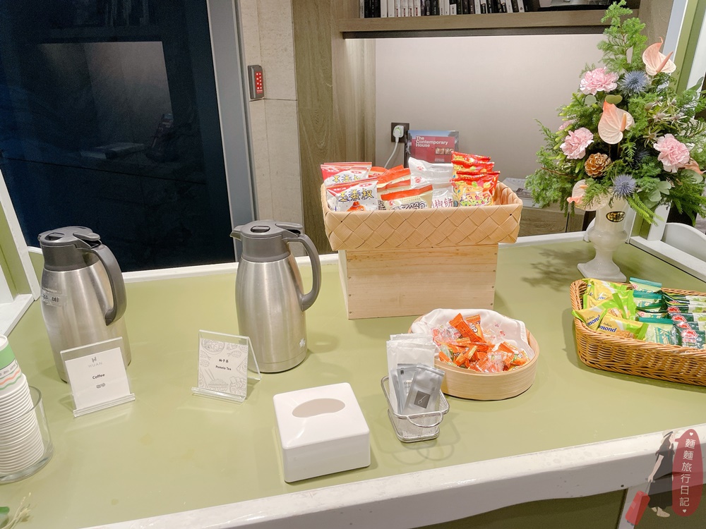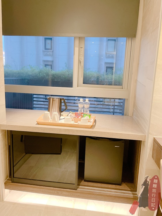 進來先看到小茶水櫃空間,檯面上就是熱水壺跟礦泉水咖啡茶包杯子等,是每間酒店房間的基本配備吧!櫃子下方是小台的冰箱,冰箱裡有汽水,冰箱旁邊則是簡單的置物櫃。
